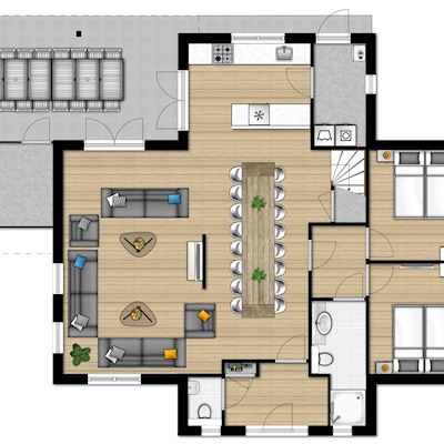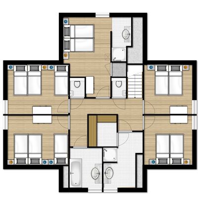 - Drie slaapkamers met twee 1-persoons boxsprings op de eerste verdieping