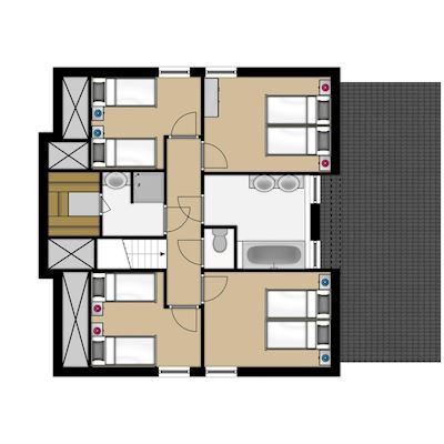 - Quatre chambres à coucher avec deux lits boxspring pour 1 personne au premier étage
