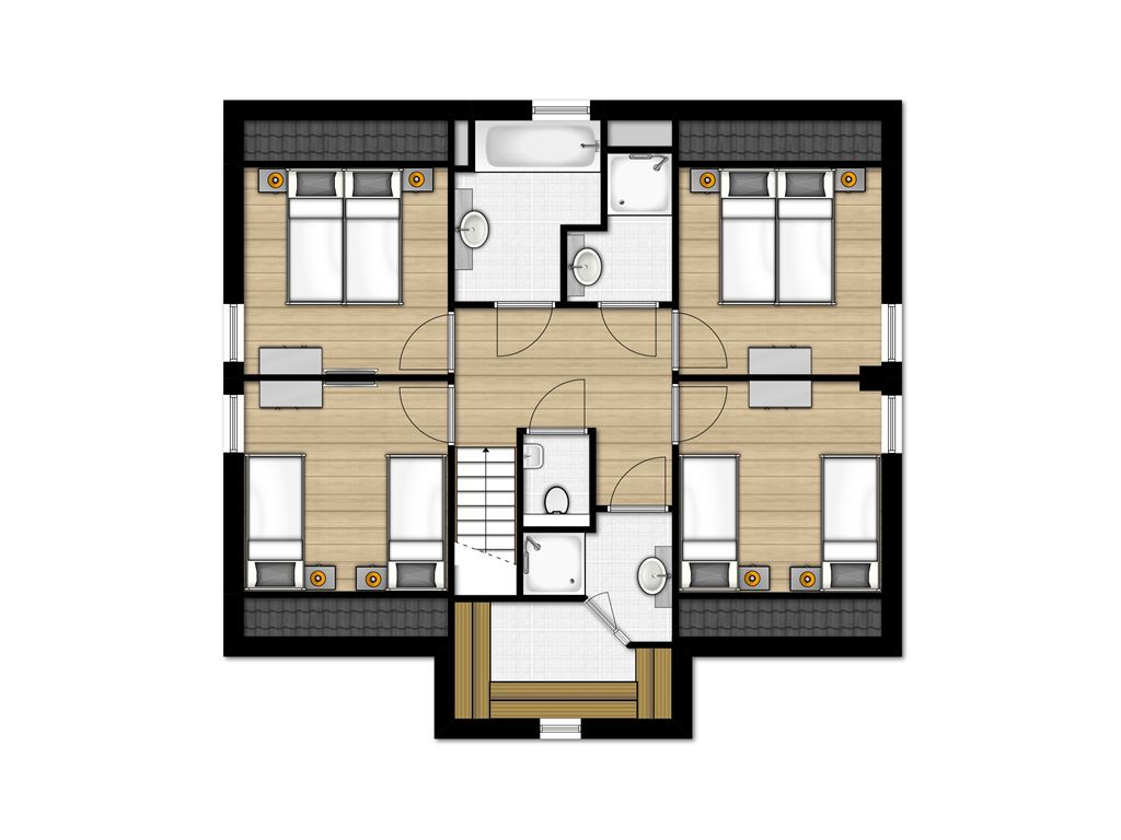 - Quatre chambres à coucher avec deux lits boxspring pour 1 personne au premier étage