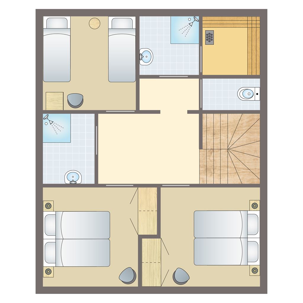 • Drie slaapkamers met twee 1-persoons boxsprings in het souterrain
