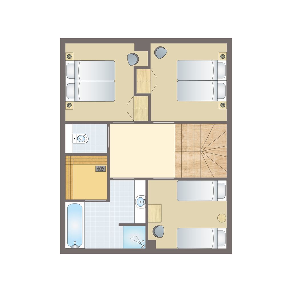 - Badkamer met ligbad, douchecabine en dubbele wastafel op de eerste verdieping