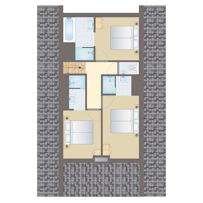- Drie slaapkamers met twee 1-persoons boxsprings op de eerste verdieping