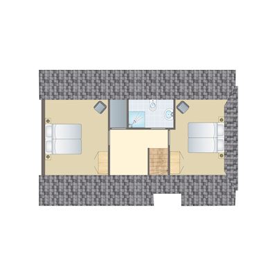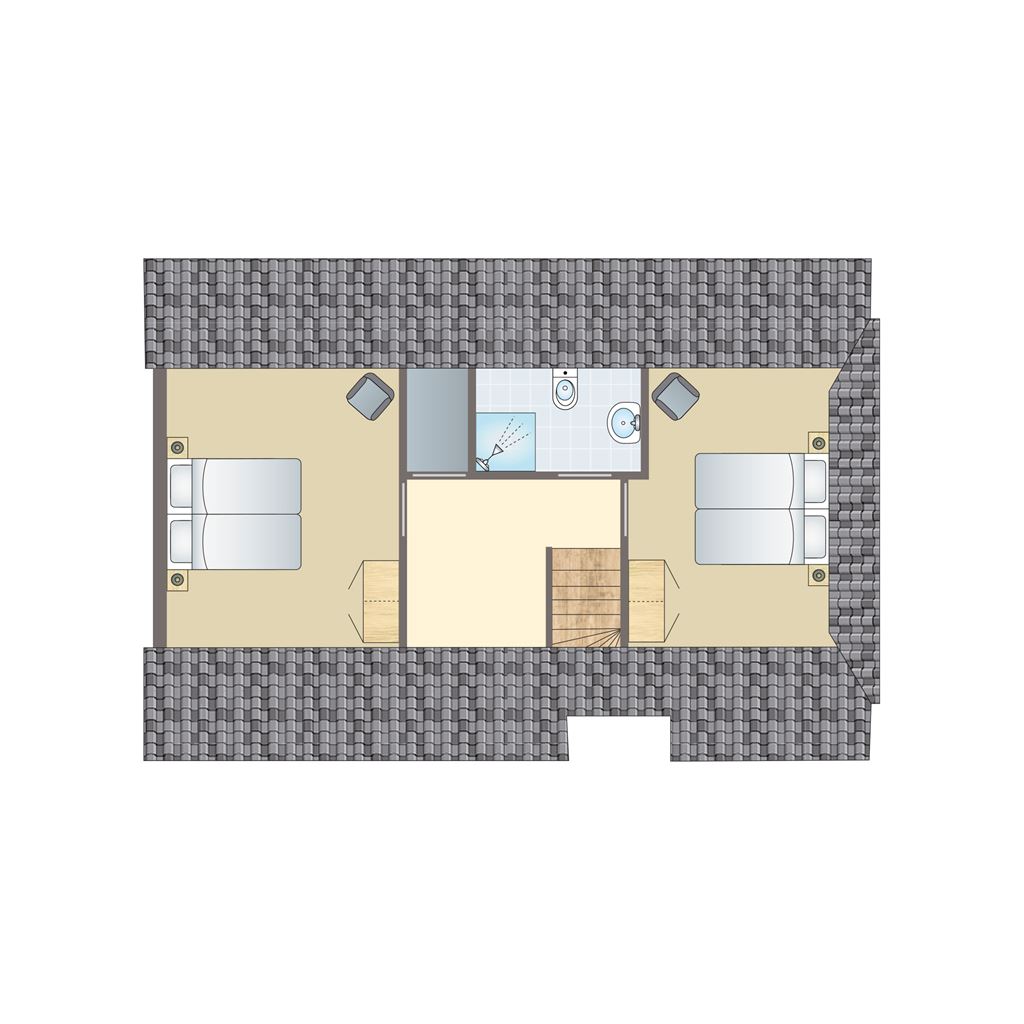 • Twee slaapkamers met twee 1-persoons boxsprings op de eerste verdieping