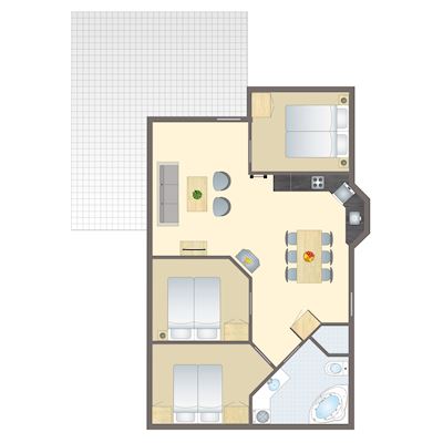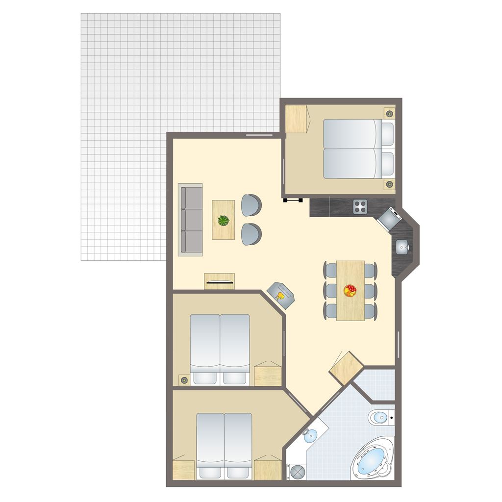 Vrijstaand vakantiehuis met bubbelbad, ruime woonkamer en een gedeeltelijk overdekt privéterras. Er zijn drie slaapkamers met elk twee bedden en één vide met twee matrassen. De vakantiehuizen zijn privébezit, daarom zijn beschrijvingen, foto's, specificaties en plattegronden van de vakantiehuizen indicatief en kunnen ze afwijken.