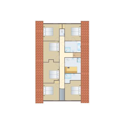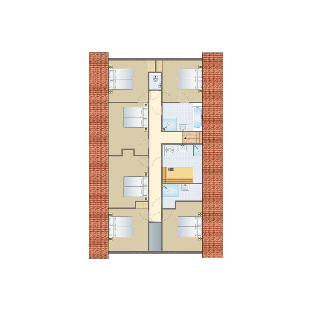 - Vijf slaapkamers met twee 1-persoons boxsprings