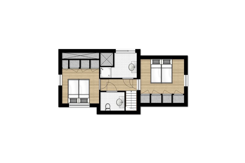 - Slaapkamer met twee 1-persoons boxsprings en stapelbed