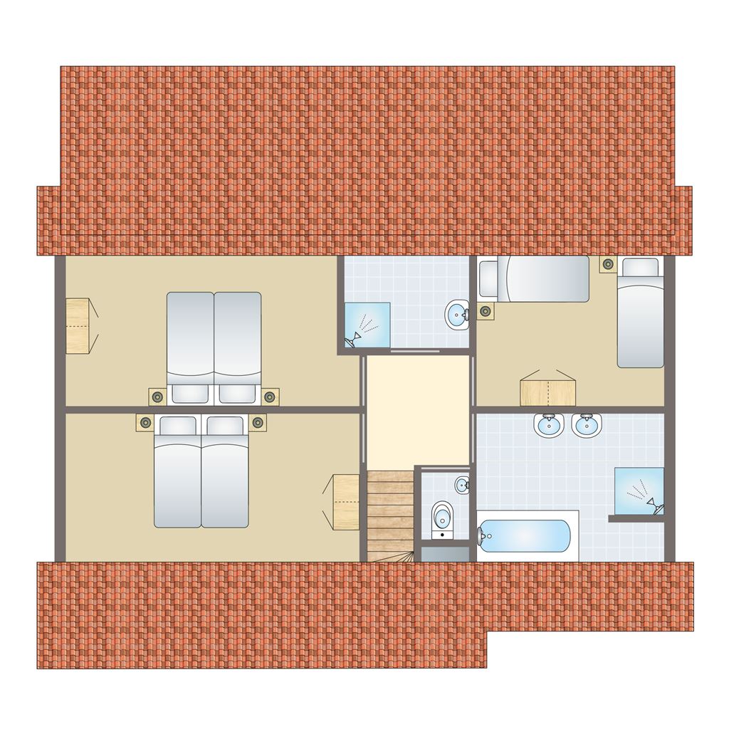 - Badkamer met ligbad, douchecabine en dubbele wastafel op de eerste verdieping