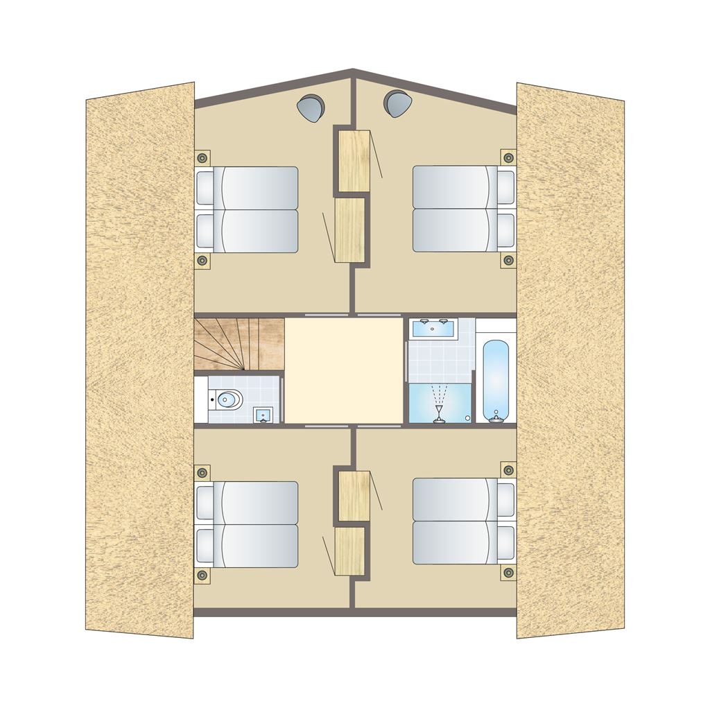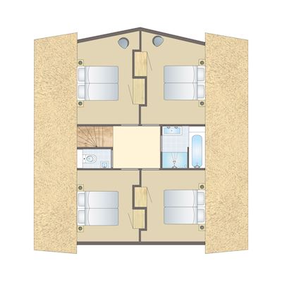 - Twee slaapkamers met twee 1-persoonsbedden en softtopper op de eerste verdieping